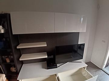 Mobile soggiorno composto da due cassettiere, due pensili, due mensole colore bianco e boiserie legno color wenge.