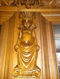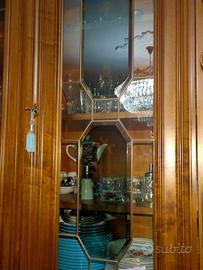 Mobile da sala in noce massello anni 80, intarsiato come da foto, componibile da 4 colonne con sportelli a vetri e sportelli chiusi, 4 cassetti, piani interni, misure alt.punt più alto 270, largh.60 lungh.290