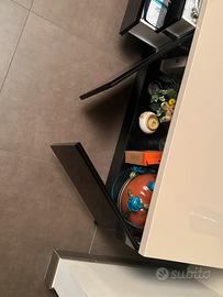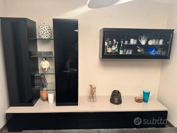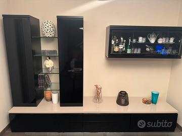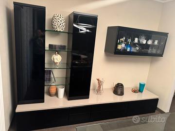 Mobile soggiorno con vetrinetta sospesa , color nero lucido laccato, e piano top color tortora laccato. Misure : lunghezza totale cm. 305, profondità cm.60, altezza cm.208.