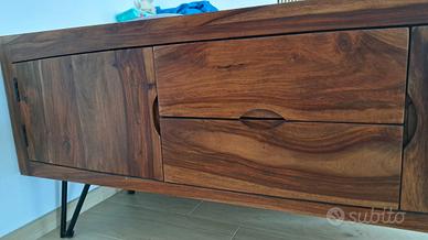vendo mobile soggiorno/porta tv in legno massello di palissandro. Acquistato nel 2022 e tenuto benissimo,nessun graffio, come nuovo. Vendo per cambio tipologia di arredamento misure L150 P45 H63 Non spedisco, ritiro a carico dell'acquirente