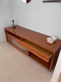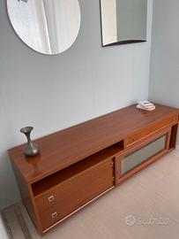mobile in decorativo ciliegio dim.: L.188x53 prof x 52 h portaTV e stereo, con 1 anta vetrina scorrevole, 3 cassetti e vano giorno. Prezzo listino 790,00 nostra proposta euro 159,00 IVA inclusa. Spese di trasporto da concordare a parte