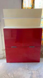core rosso(come l’ arancione scuro) e beige…mobili + mensole beige + due tavoli bassi per il tv