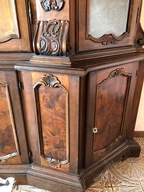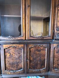 mobile soggiorno in noce, con pannelli in radica di noce, vetrina centrale e laterali larghezza 2,60cm -2,70cm Trasporto e montaggio non incluso