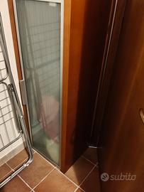 Mobile soggiorno 3 pezzi: 1Base 250lx60px66h, 2pezzi da appendere al muro 127lx43px47h. Letto con materasso 90x200, Tavolo con 4 sedie in pelle 90x90 allungabile fino a 180.