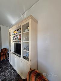 Mobile da soggiorno tenuto benissimo in legno con vetrine, tavolo di cristallo in ottone piu 4 sedie vintage. Mobile gia smontato pronto per ritiro 200 euro Tavolo cristallo in ottone piu 4 sedie 450 euro Solo per chi e disponibile a ritirarli