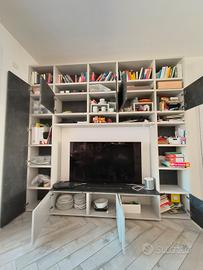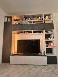 Vendo mobile soggiorno libreria tv Febal in legno bicolore grigio chiaro e stone gray effetto pietra, come nuovo.