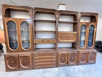Mobile di grande impatto estetico, ideale per arredare soggiorno, taverna o casa in stile vintage/classico. Struttura solida e molto capiente, con vetrine laterali, ripiani a giorno, cassetti e numerosi vani contenitore.