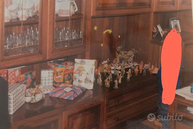 Mobile in legno per sala/soggiorno, composto da due pezzi attualmente separati ma che formano un unico mobile come visibile in foto. Misure del mobile unito: Lunghezza 270cm, Altezza 237cm, Profondità 60cm (35cm la parte superiore).