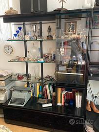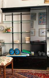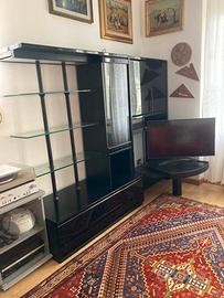 Treviso fuori mura. Laccato nero, tipico dell’epoca, moda che ritorna! Molto buone le condizioni d’uso e di struttura solida . Molto funzionale, in particolare per rotazione piano Tv . Il piano TV puo’ essere sfilato e dal mobile lasciando libero spazio per mettere una piccola scrivania. Mobile con ripiani cristallo predisposto di illuminazione. Sono due moduli agganciati : max ingombro, primo modulo 148x60x h 196; secondo modulo 103x45x h196; piano TV 96x63 profondità. Tutto facilmente smontabile. Cortesemente, no perditempo, no consegna a domicilio. Minimo di trattativa sul prezzo.