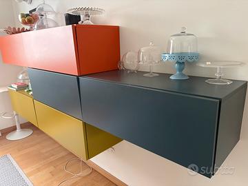 Credenza soggiorno/sala da pranzo Pianca originale. Sei moduli sospesi con anta frontale. Tre colori: arancio, blu polvere, verde. Finiture opache. Misure di ogni modulo: altezza 33 cm, lunghezza 90, profondità 42. Vendo per cambio arredo