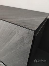 Vendo causa trasloco mobile da sala, composto da tre pezzi. Due pezzi di 1 m ciascuno alcon apertura a ribalta (a pressione) rivestiti in vetro anteriormente e un pezzo di 2 m con copertura scorrevole rivestita in pietra. Prezzo originale 3500€