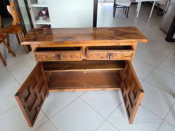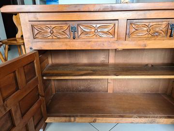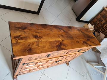 mobile spagnolo soggiorno salotto madia mobile basso in legno massello stile spagnolo. In buone condizioni; intagliato anche sui fianchi è composto da cassetti e antine con chiusura a chiavistello. Misure : lunghezza 125 cm; profondità 36 cm; altezza 80 cm; ritiro a mano a Trieste, già a piano terra e facile parcheggio eventuale consegna da concordare