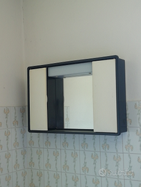 Specchiera bagno vintage primi anni 70 in ottimo stato di conservazione. Marca CM modello Adamello costruita in bakelite con luce e presa elettrica. Colore: struttura nera e ante bianche. Misura:68x45x13.