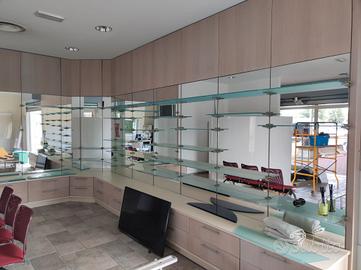 Vendiamo mobile componibile in perfetto stato, utilizzato fino ad ora in un negozio di ottica per esposizione occhiali, a causa di cambio locale. E' modulare e ad angolo (può essere ripartito come si preferisce) e la lunghezza complessiva è circa 7m, altezza massima 3 metri (anche qui componibile per ambienti piu bassi in quanto diviso in sezioni). Le mensole in vetro e i supporti possono essere disposti come si vuole a varie altezze. Prezzo trattabile.