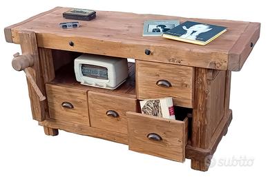 Mobile artigianale in legno massello, stile banco falegname con morsa legno o senza, con 1 o piu' cassetti , ripiani e vano portaoggetti, su misura e su ordinazione anche con modifiche, tinta a scelta. stile invecchiato, impregnante e vernici all' acqua opaca o semilucida. disponibile solo su ordinazione su misura. il prezzo esposto e'per il modello con 1 cassetto sotto il piano e ripiano lungh. 140- cm. circa , posso consegnare in zona o spedire.larg. media 140- 150- cm. prof. 50-60 cm. Ideainlab