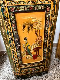 L'oggetto mostrato è un mobiletto o contenitore in stile orientale, spesso descritto come stile Chinoiserie. È caratterizzato da una finitura laccata in nero o marrone scuro con decorazioni dipinte a mano e dettagli in oro, raffiguranti scene tradizionali, paesaggi o simboli augurali.