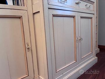 Vendo mobile stile provenzale Grange, color avorio con finiture artigianali a cera. Ante centrali scorrevoli per TV. Legno vero e tecniche di costruzione di antica ebanisteria. Fornisco alte foto dettagli su richiesta. Ingombro cm 200 x h cm 210 c.a smontabile pre trasporto in 3 pezzi (2 laterali + 1 centrale).