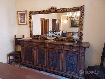Credenza in noce massello stile rinascimentale riccamente e finemente intagliata, adatta per abitazioni, casali e agriturismi. Possibilità di vendita dello specchio abbinato.