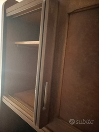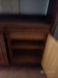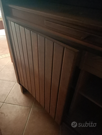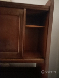 Credenza svedese condizioni perfette ante superiori scorrevoli in cuoio e sotto sportelli con ripiani e cassetto, perfetto stato, si costituisce di due parti unite tra loro quindi facilmente trasportabile, misure: larghezza 130, profondità 39, altezza massima 193