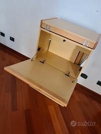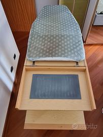 mobile il legno della Foppa Pedretti con tavola da stiro e poggia ferro da stiro, con 2 sportelli con spazi contenitori. La tavola comprende la copertura e il feltro sotto la copertura. il mobile ha le ruote per poterlo spostare agevolmemte.