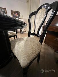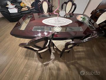 Mobile, tavolo con sedie e cristalliera antichi. In perfette condizioni. Effetto lucido. Completo di 6 sedie.