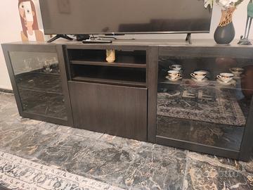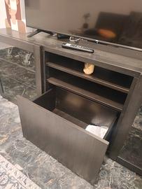 mobile TV in colore nero con cassetto centrali e ripiani in vetro