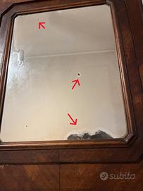 Colore noce, condizioni buone, con normali segni del tempo: necessita di un piccolo restauro per valorizzarlo al meglio (specchio - vedi foto, cassettone, lucidatura o ritocco della vernice).