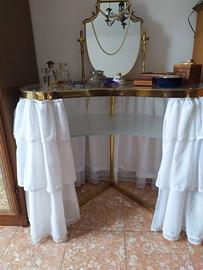 Toilette a fagiolo con specchio, in ottone, con tenda e piano in vetro.