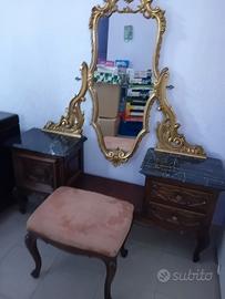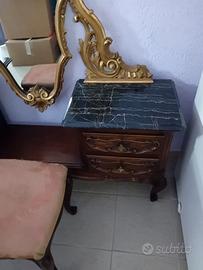 toilette stile barocco in noce nazionale con poltroncina. realizzato da artigiano torinese nel 1950. ripiani in pregiato marmo nero. mobile ben conservato. lunghezza cm 138 altezza cm 162 profondità cm 37