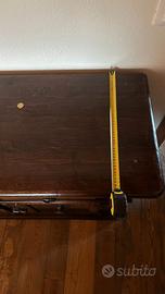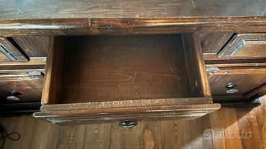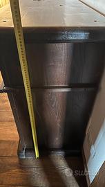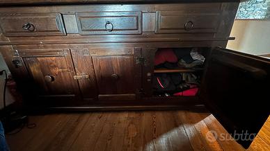 Credenza in legno marrone scuro larghezza cm. 177, profondità cm. 47, altezza cm. 90. Tre cassetti e tre vani con ripiano intermedio.