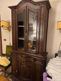 Tromeau in radica di noce , parte superiore a 2 sportelli a vetri , interno a 3 ripiani , 1 cassetto centrale , parte inferiore ad uno sportello con ripiani all’interno . Il mobile si divide in 2 parti ( superiore e inferiore ) per un miglior trasporto