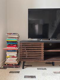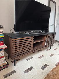 Vendo elegante mobile TV a due ante, acquistato da Beliani. Realizzato in fibra a media densità (MDF) e legno di caucciù, è solido e resistente. È dotato di fori posteriori passacavi che consentono di mantenere tutti i cavi nascosti e ben organizzati. Gli armadietti sono spaziosi e i cassetti ampi. Prezzo originale 199 €.