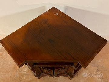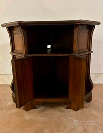 Mobile Tv ad angolo, in legno tinta noce, alto cm 80, con vano sottopiano e 2 porte per vano pottaoggetti o bottiglie. In buono stato, qualche difetto di colore sul piano.