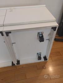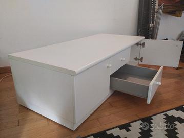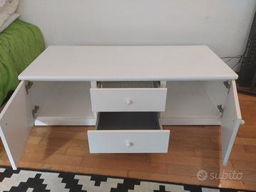Mobile TV bianco molto capiente e robusto. 2 compartimenti con ante e due cassetti centrali. Ho aggiunto delle rotelle sotto per poter spostarlo comodamente. Presenta piccoli segni d'usura ma è molto resistente ( e pesante !). Perfetto per la TV in salotto o nella camera dei bambini per la console e videogiochi dimensioni: 135x60x41 ritiro in mano Metro San Leonardo. Posso dare una mano per caricare in auto ovviamente . prezzo trattabile