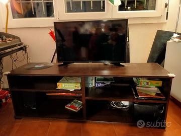 mobile TV in legno scuro, robusto, i ripiani si possono montare con altezza variabile. misure: h 54 - 150x 42 cm. consegna completamente smontato in pochi pezzi. facile da trasportare. (gli ancoli bianchi in foto si staccano, sono le protezioni per i bambini)