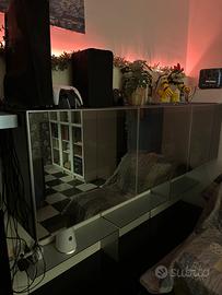 Mobile tv, in legno con luce integrata nella mensola. Due cassetti capienti in basso e 3 stipetti in alto con la facciata a specchio. Parte dietro sempre in legno bianco. Lunghezza più di 3metri