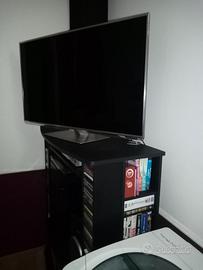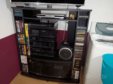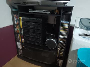 Mobile per TV, stereo, DVD e accessori vari, con ruote, molto resistente. Composto da un vano centrale aperto sia frontalmente che sul retro, per passaggio fili, 2 vani frontali dotati di porta CD, cassette, DVD oltre a 2 vanii laterali. Il mobile è componibile, i vari elementi possono essere spostati per aumentare o diminuire i vari spazi e adattarlo alle varie esigenze. Misure: larghezza massima cm. 115, profondità max cm. 50, altezza cm. 131, vano inferiore con vetro larghezza cm. 80 x altezza cm. 39, vano centrale grande di cm. 80 di larghezza x 65 di altezza, vano piccolo cm. 80 x cm. 12 di altezza.