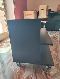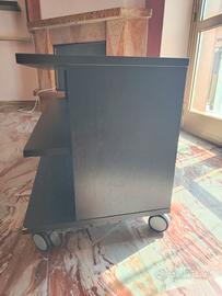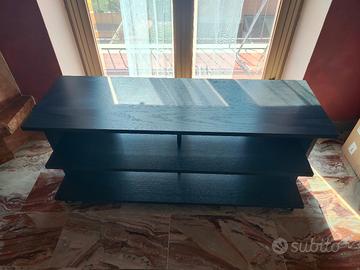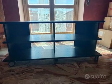 Mobile TV con rotelle ikea, colore wengè. In ottimo stato. Larghezza 1,17 Altezza compresa di rotelle 51cm Profondità 1 e 2 ripiano 38cm Profondità 3 ripiano basso 42 cm Piccole righe angolo destro, come da foto. Ritiro zona La Rustica. Sul profilo altri mobili in vendita