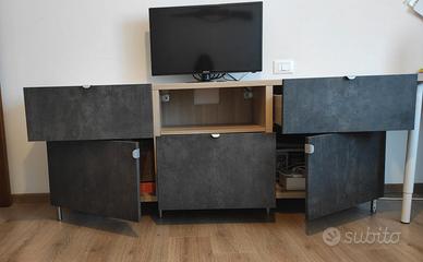 Splendido mobile TV/consolle IKEA BESTA con scomparti e cassettiera (cm. 180x40x64 cm.) con gambe da 10 cm. color acciaio.