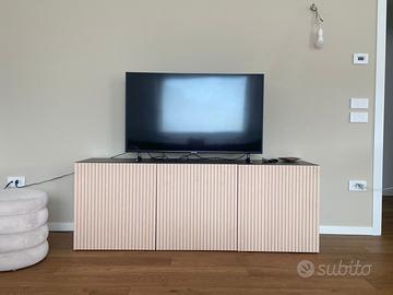 Finitura moderna con ante a doghe verticali e piano superiore liscio, ideale come mobile TV o credenza.