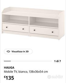 Vendo mobile TV modello IKEA HAUGA in colore bianco, in ottime condizioni, come visibile dalle foto. Dimensioni: * Larghezza: 138 cm * Profondità: 36 cm * Altezza: 54 cm Prezzo: 55€ (prezzo originale IKEA 135€) Info logistiche: * Ritiro: Esclusivamente a mano a Torino *prezzo trattabile*