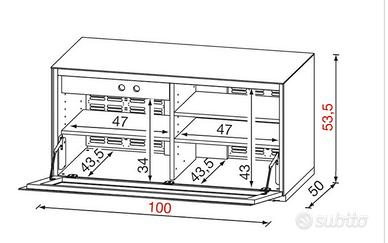 Mobile Munari per TV con vetro laccato che consente l'imput del telecomando, illuminazione LED, predisposizione per aerazione dei componenti interni, impianto elettrico utile alla connessione della tv, dei decoder e dei lettori dvd, il cui passaggio dei cavi avviene in modo organizzato e nascosto. Gli interruttori comandano i led e tutti i componenti collegati all'impianto elettrico del mobile. Ruote nascoste.