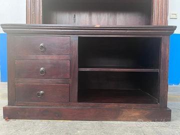 Mobile porta TV in legno massello di colore scuro, con tre cassetti laterali dotati di maniglie ad anello in metallo e ampio vano a due ripiani aperti, ideale per riporre decoder, console, libri o oggetti decorativi.