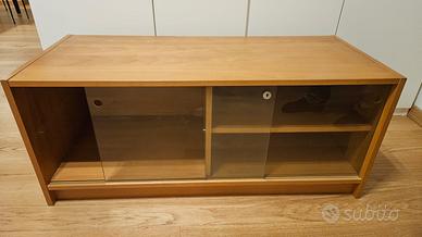 Mobile TV 118x50x50 con ante scorrevoli in vetro e ripiano ad altezza regolabile.