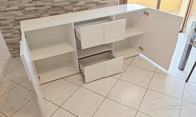 Mobile TV madia credenza contenitore, collezione dama dal design moderno per arredare il tuo soggiorno, la cucina o sala da pranzo. Composto da due ante a sportello, due cassetti capienti, vano a giorno centrale per l'esposizione con ripiano in vetro, ripiano superiore sfruttabile anche come piano d'appoggio. Colore bianco lucido. Struttura in legno con materiale nobilitato melaminico di alta qualità, materiale durevole e resistente ai graffi. Dimensioni : 180 larghezza x 82 altezza x 43 profondità. Il mobile si presenta complessivamente in Ottime condizioni, senza difetti visibili. Ritiro ad Assemini. Necessarie almeno due persone per il trasporto e ritiro del mobile in quanto non è possibile smontarlo. Prezzo trattabile.