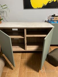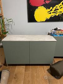 Vendesi bellissima combinazione IKEA BESTÅ composta da due moduli accostati, perfetta come mobile TV o credenza per il soggiorno. Il design è minimale, con ante a pressione (push-open) per un look pulito senza maniglie. Caratteristiche principali: Dimensioni totali: Lunghezza 240 cm (120+120), Altezza 75 cm (65cm mobile + 10cm piedini), Profondità 40 cm. Colore: Ante verde salvia opaco (molto elegante e facile da abbinare). Piedini: in metallo, che facilitano la pulizia del pavimento. Stato: Ottime condizioni generali, ben tenuto. Extra: Include ripiani interni regolabili e top grigio in fantasia cemento. Ritiro: A carico dell'acquirente in zona centro Sarca. Il mobile può essere diviso nei due moduli originali da 120cm per un trasporto più facile.