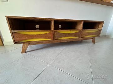 Mobile TV di qualità Maisons Du Monde in legno di mango massello, perfetto per organizzare il tuo televisore e i dispositivi multimediali. Design moderno e pratico, offre ampi scomparti per riporre lettori DVD, decoder, console e altri accessori. In buone condizioni, ideale per chi cerca un mobile funzionale e di stile.
