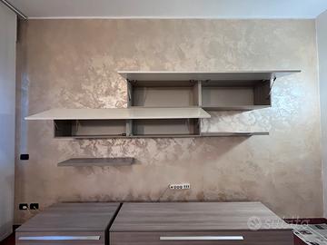 Contenitori a parete: due moduli sovrapposti sfalsati da 180x30x35 cm con anta a ribalta laccato color avorio