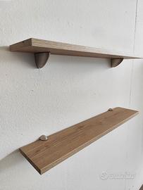 Basi e mensole con ante effetto rovere nodato, pensili sospesi effetto tessuto grigio chiaro.