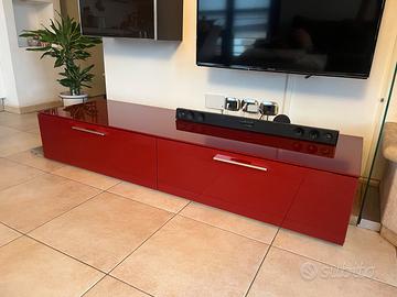 Vendiamo mobile tv elegante in legno resistente con piana di vetro, di queste misure: H: 32 cm L: 192 cm P: 60 cm Il mobile è tenuto ottimamente, il colore è rosso laccato. Ritiro a carico dell’acquirente.